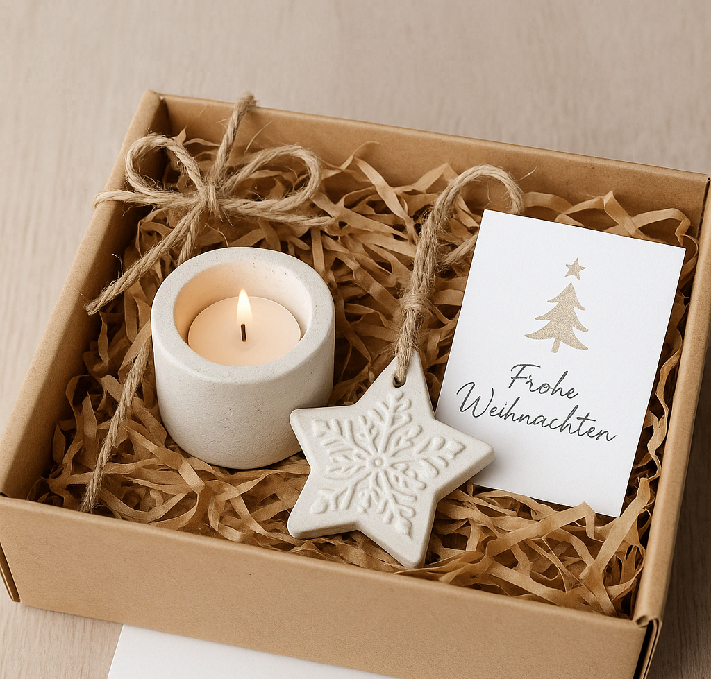 Die beiliegende Mini-Weihnachtskarte macht das Set komplett – alles sorgfältig und ästhetisch in einer naturfarbenen Geschenkbox verpackt. Ein kleines Geschenk mit großer Wirkung.